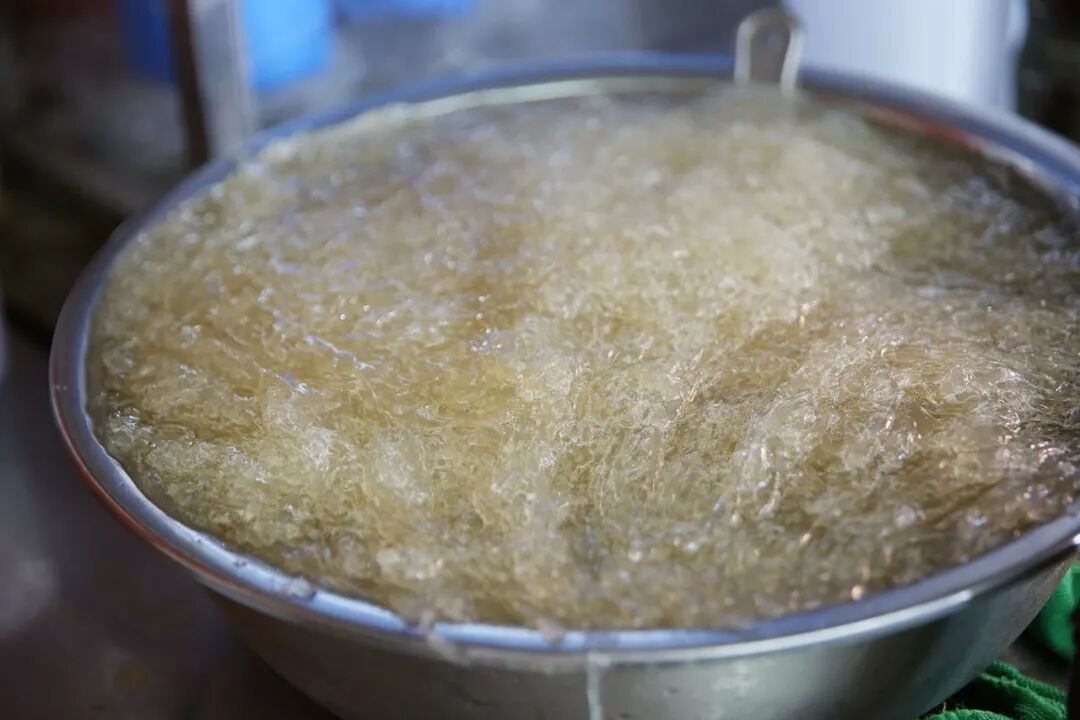 海星虫常年在滩涂打洞,处理的要点在于去除泥沙。在土缸里养上一天,然后用圆柱形的石锤滚动碾压出内脏及杂物,洗净后加水煮沸。海星虫富含胶质,胶原蛋白在升温中融于水,盛碗冷却便可如果冻一般,爽滑剔透。