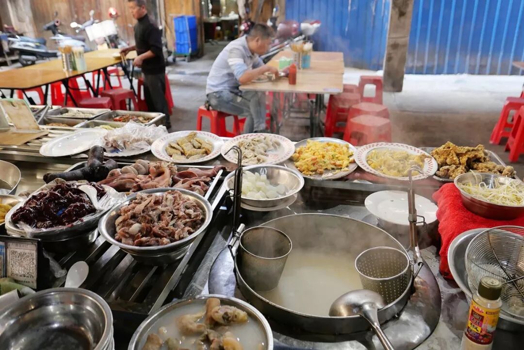 打菜类似打盒饭,码放在一个盘子中。因为是早上集中备好,所以除了现煮的热炒、热汤,菜都温热偏凉,置身其中的体验感要明显胜于食物带来的冲击。