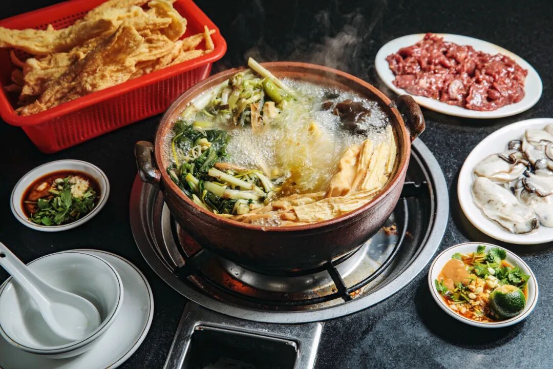 除了糟粕醋火锅外,海口还有一种特殊的打边炉——斋菜煲。斋菜,原为道家、佛家烹任的以三菇六耳、瓜果蔬茹及豆制品为主的素食菜肴,被会吃的琼山人当作火锅涮菜,再注入灵魂高汤。