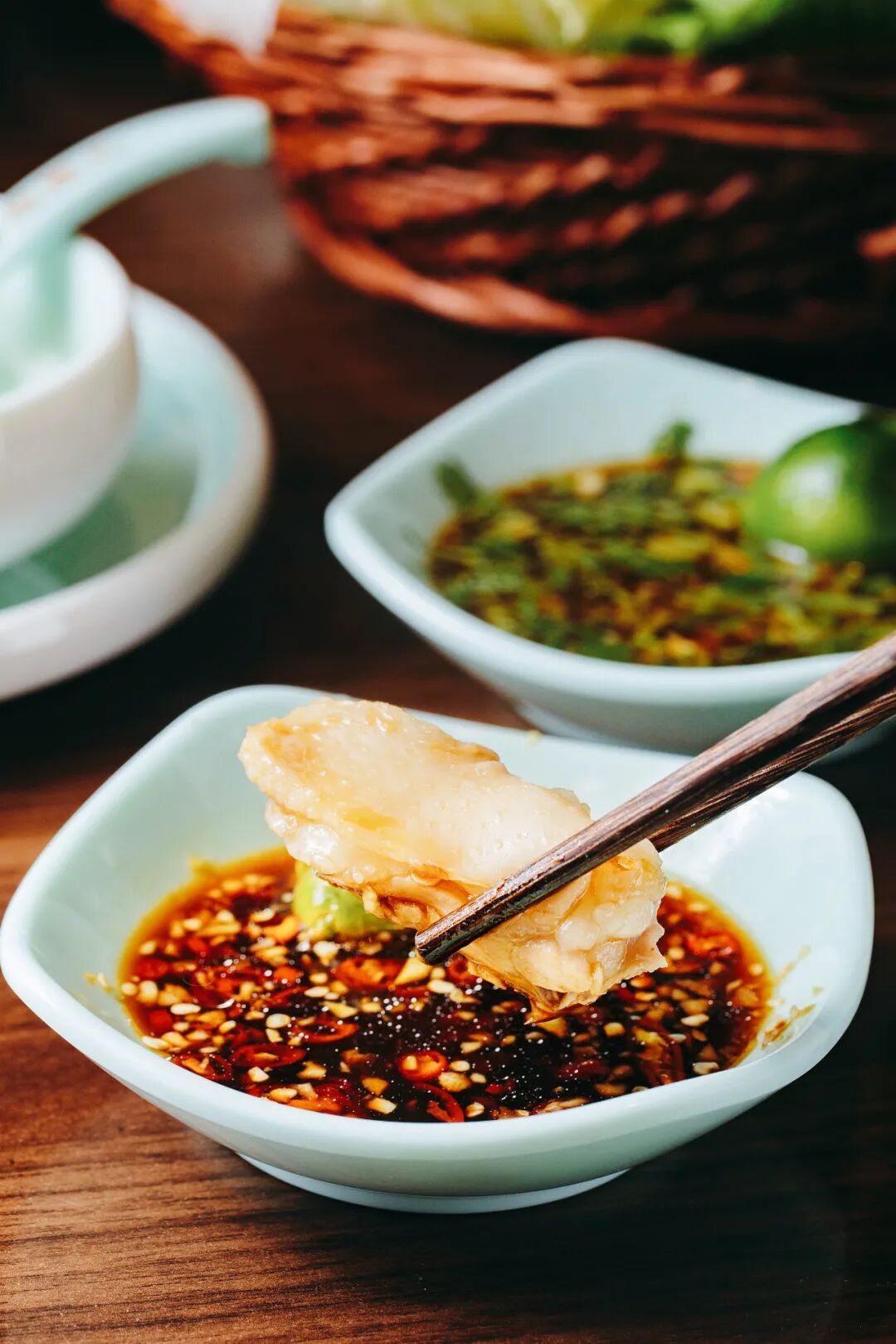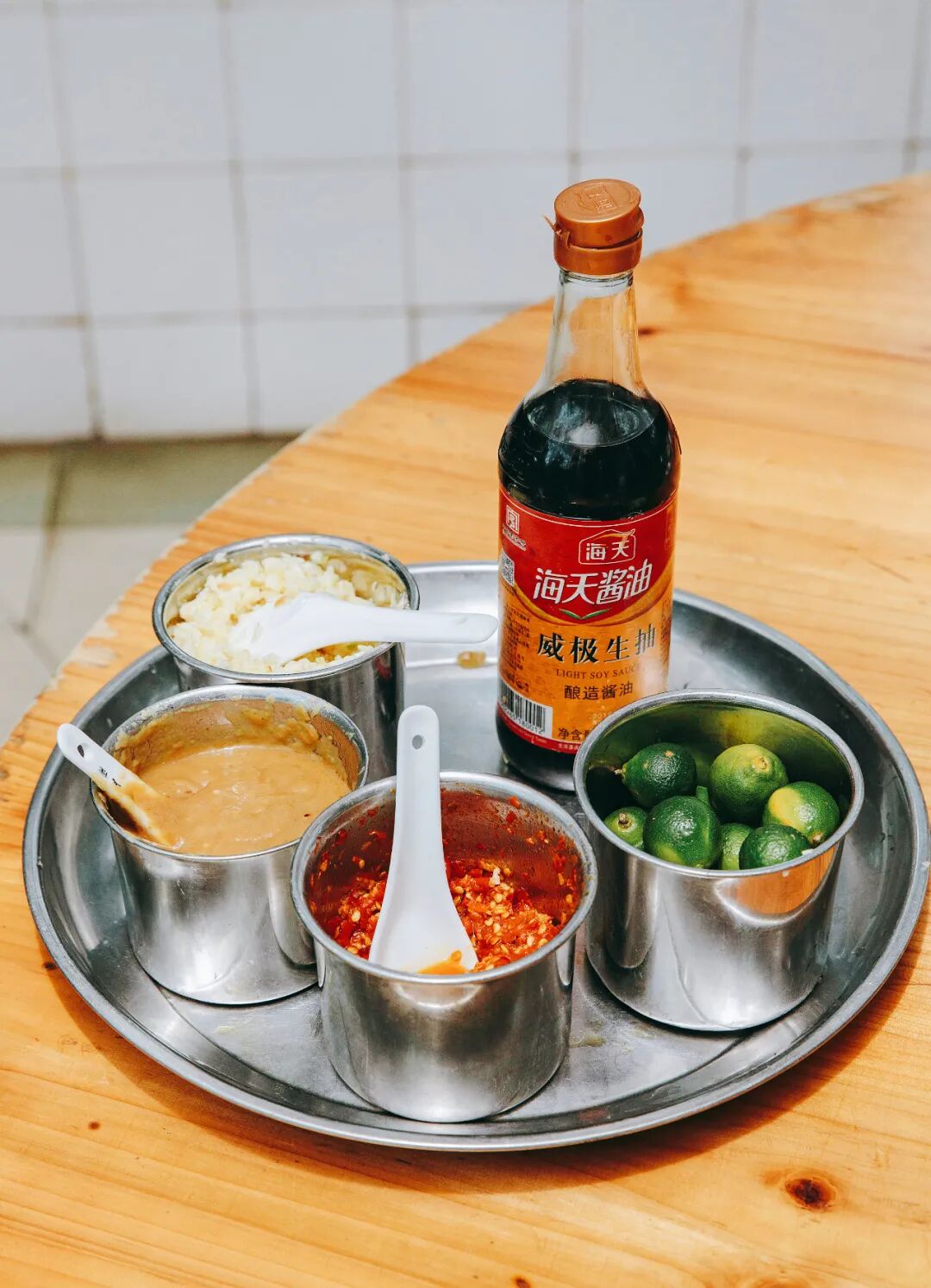 海口人把蘸料称之为揾碟,有一个万能的组合:主角有生抽、什锦酱、小青橘、蒜泥、红黄灯笼辣椒,几乎每家店桌上都会摆着一整套。