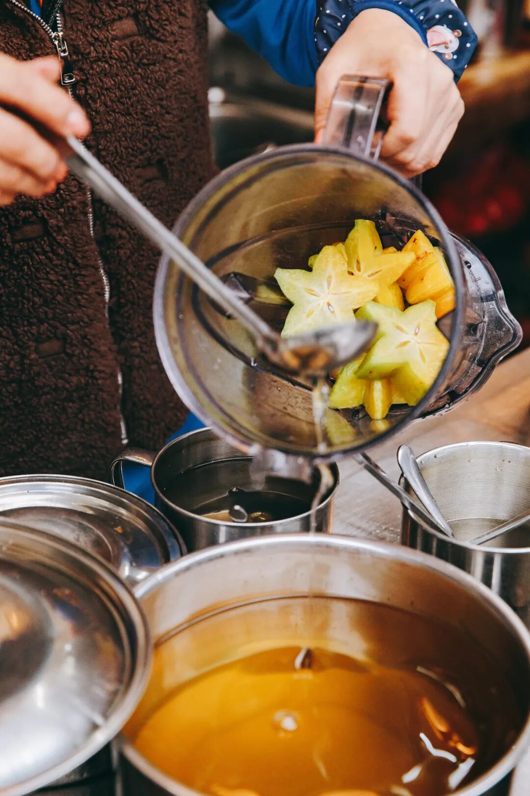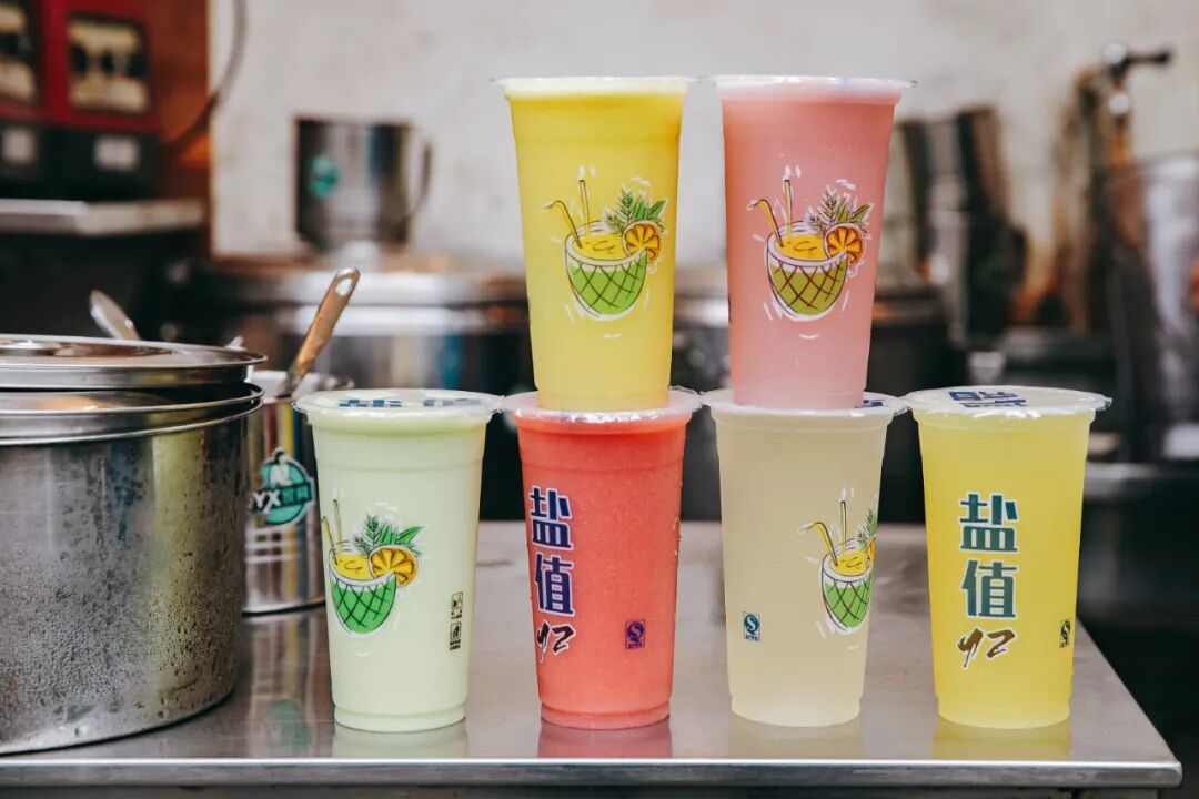水果榨好的汁过筛,加入冰糖糖浆,最后倒入老盐水,一杯老盐饮料就做好了。