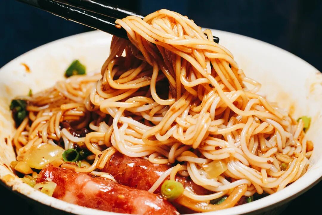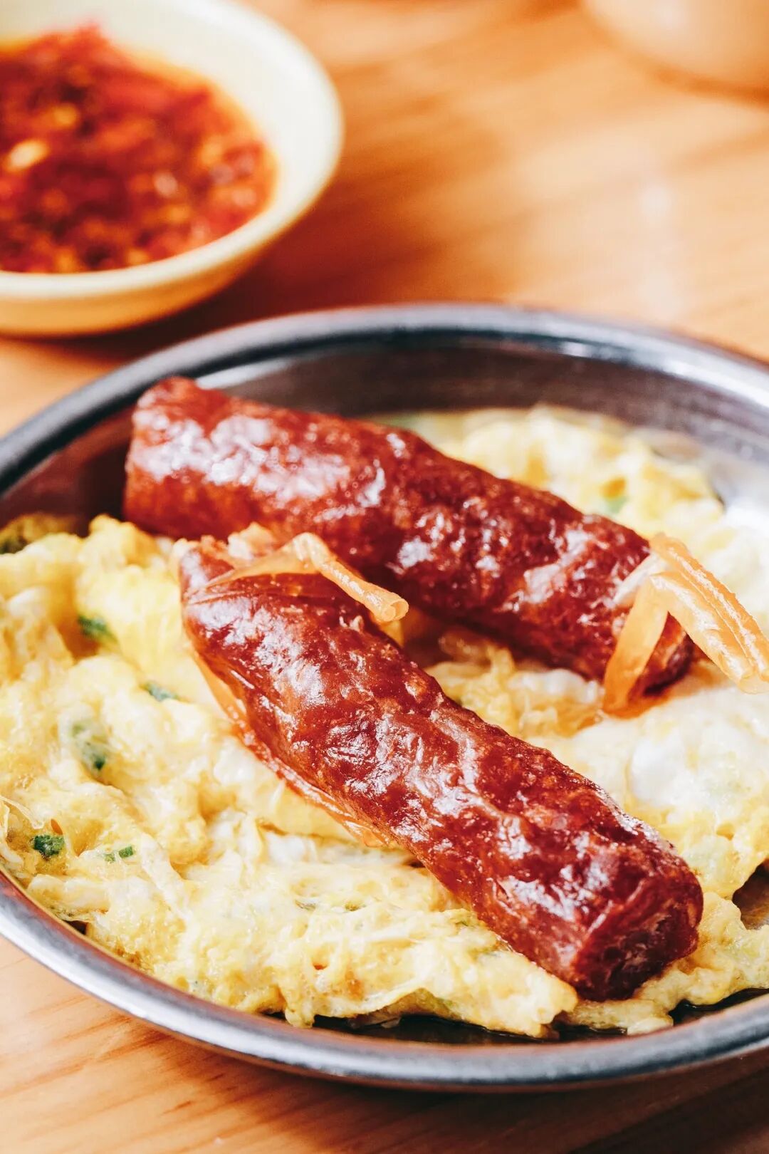 油滋滋的腊肠,煎得火候正好,外皮焦脆,内里咬开肉汁四溢,肥肉和瘦肉的配比适中,丝毫吃不出油腻。