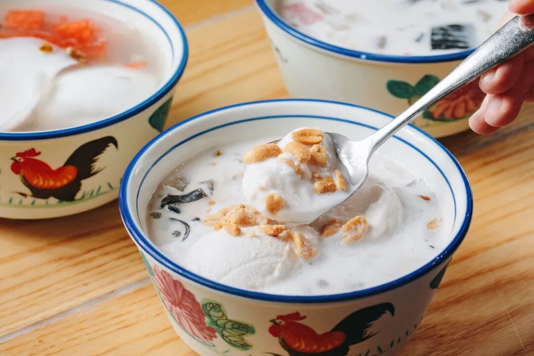 椰肉刮出打碎,下锅煮开后放凉,加入白糖和炼乳,升级成椰奶清补凉。