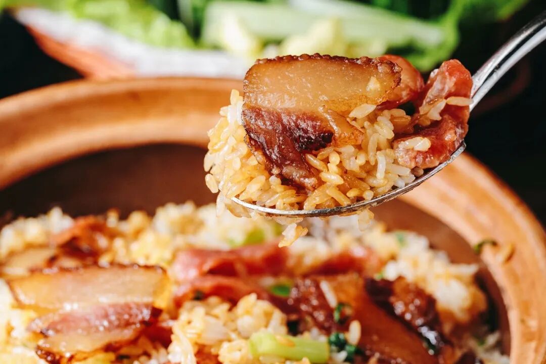 吃椰子鸡火锅最后要留点肚子给煲仔饭,腊味的油脂和香气渗透到每一粒米饭里,先吃腊味,再吃米饭和灵魂锅巴,甘香味浓。