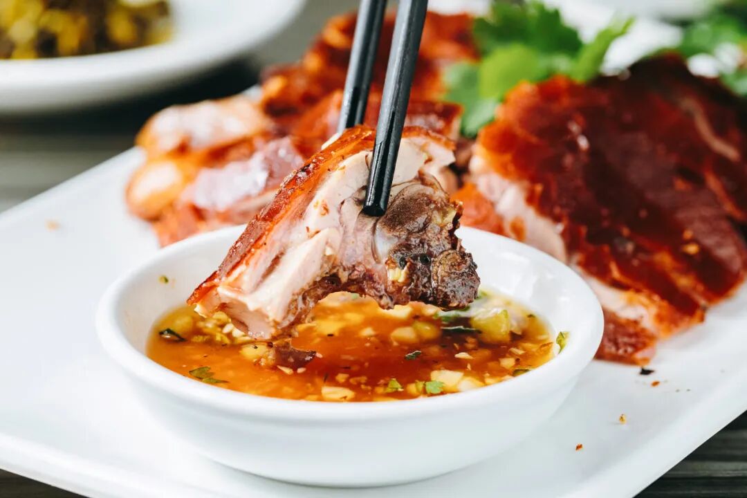 猪皮一定要蘸白糖吃!乳猪的香味和白糖的甜糅合在一起,把乳猪的酥脆放到了最大。连皮带肉可以蘸店家调配好的蒜蓉水,酸酸甜甜,清爽解腻。