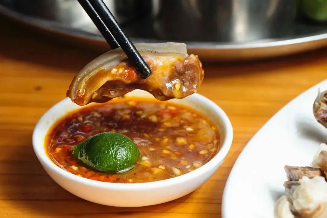 不过现在大家都打着吃斋菜煲的名义大口吃肉。夹起一块牛肉,在沸腾的汤汁里上下左右晃十几下后捞出,再在特制什锦酱中滚上一圈,牛肉的鲜甜都被激发出来。