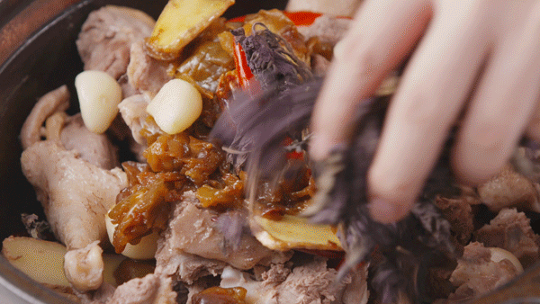 焯好的鸭子放入砂锅,加入梅子酱、干紫苏、酱油、梅酒和清水,小火慢炖1小时。
