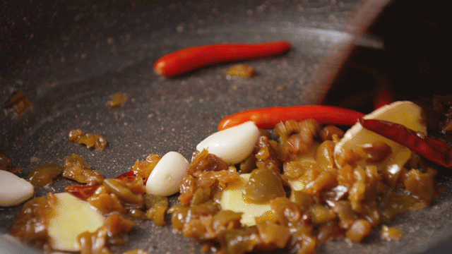 放在锅中与姜片、蒜瓣、干辣椒、新鲜朝天椒同炒,制成酸甜香辣的梅子酱。