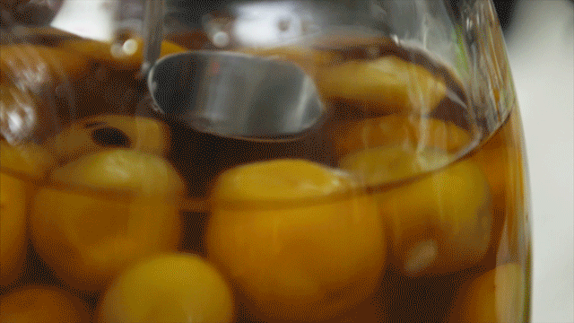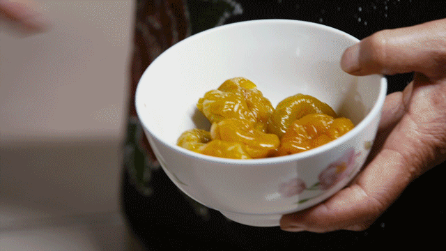 被糖包裹的雕梅还需要在腌渍过程中被不断照顾。罐子里顶层的糖融化了,就要添糖进去。2个月后,梅饼逐渐澄黄透亮,雕梅也终于做好了。