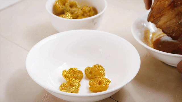 取几颗雕梅垫底,五花肉皮朝下上锅蒸到酥烂,雕梅的汁水全部渗入肉中,酸甜开胃,提鲜解腻,连肥肉都成“香饽饽”。