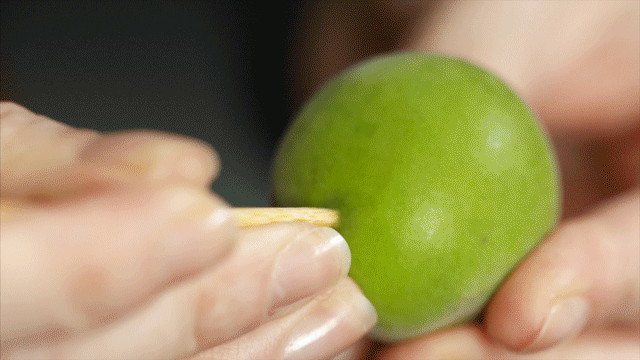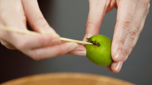 精挑细选的梅子挑去果蒂,用签子在表面戳小孔(手法参照容嬷嬷)。