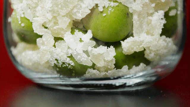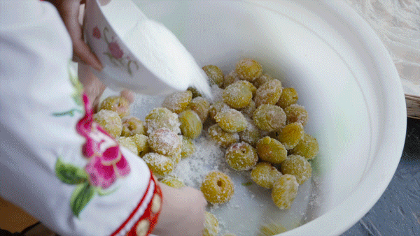 先像选美一样把青梅筛选一番,淘汰掉烂果、坏果、虫蛀果,只留圆润饱满的果子,用竹签挑去果蒂。用盐搓去表面绒毛,去除青梅的涩味,这一步被称作“杀青”。