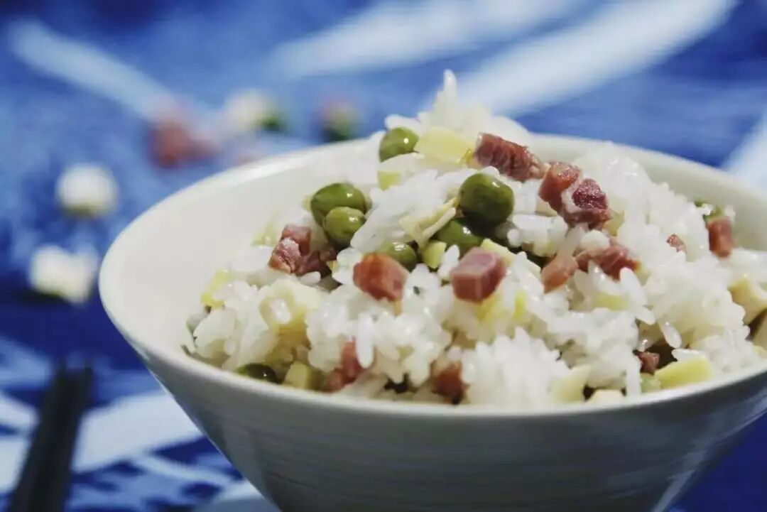 热锅起油,先下咸肉煸炒,然后依次倒入春笋和豌豆翻炒,最后放米加水稍稍没过,煮大约20分钟就可以出锅了。