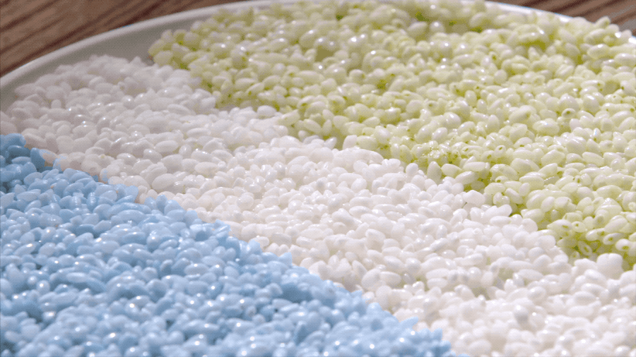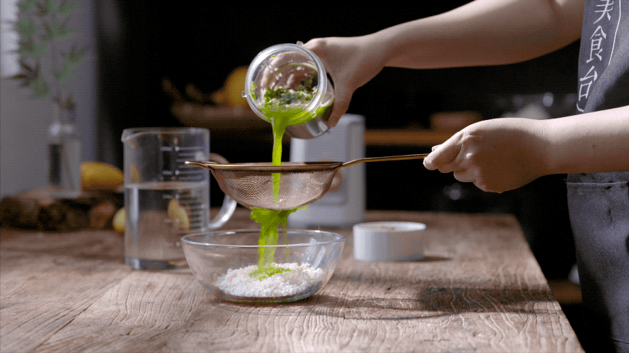 接着来给糯米饭染色,10片斑斓叶中加入300克水,搅打成汁,过滤掉渣,倒入100克糯米,浸泡3-5小时就能呈浅绿色。![]()