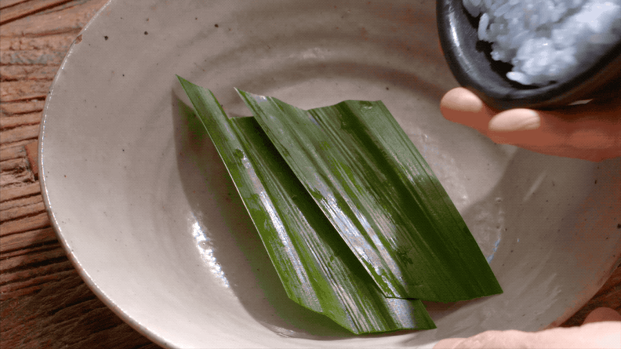 蒸好的糯米里加入温热的椰浆,搅拌均匀,放入碗中压实,倒扣放在斑斓叶上。