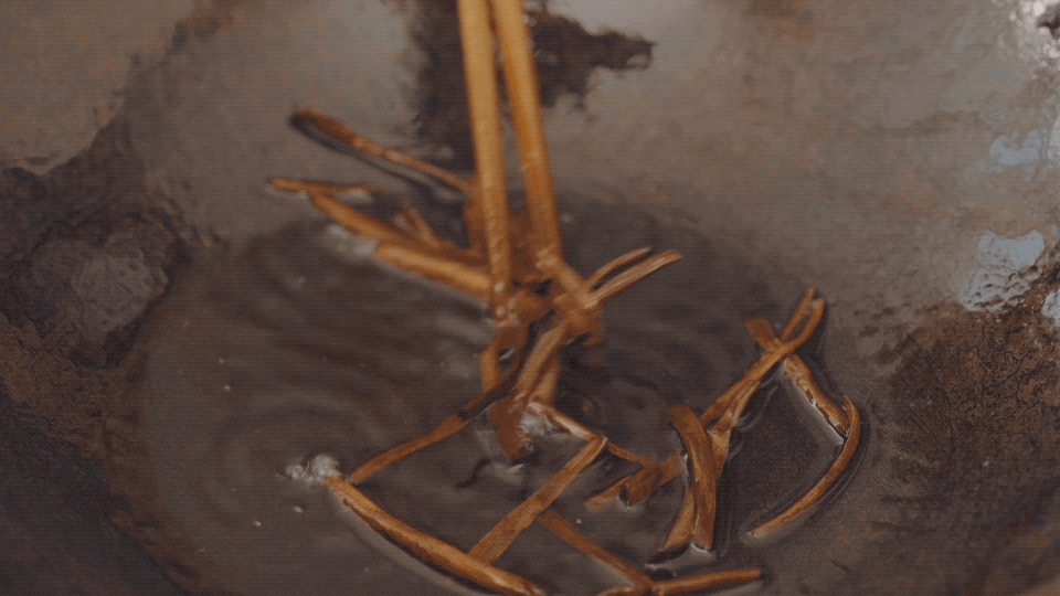 锅内留底油,油温冷却后下葱段小火煸到颜色焦黄后捞出,随后将