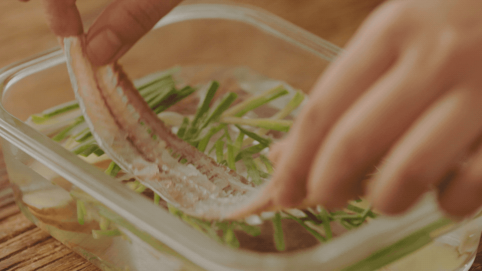 备好葱姜水,将鱼骨和鱼肉放进去浸泡30分钟,去除腥味。