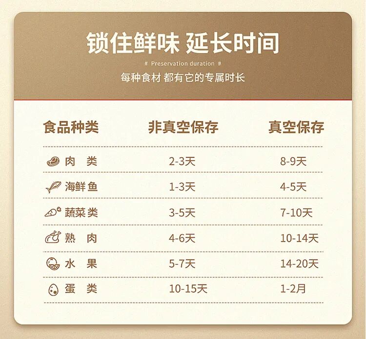 真空保存,生鲜食材保鲜期可延长2-7天不等,鸡蛋可以多存一个月,干货可以存一年。还有封口功能,特别省夹子。