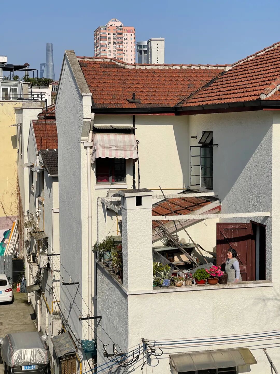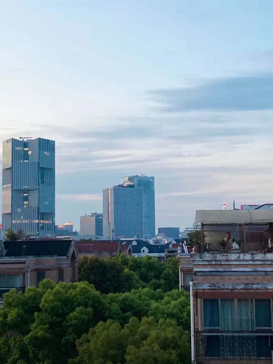 按照楼栋和楼层来排序,方便2个志愿者快速分工,从上到下和从下到上分发;简化信息,仅留下房号、份数,且字距和行距要“看着舒服”,使人在做体力活时,用简单动作获得有效信息。如今的上海,各个小区邻里都建了微信群,在一个微信群里,老人是最沉默、最容易被忽略的。45岁的曲波,13年前在徐家汇的中心地段买了房子,一个中产为主的楼盘,楼栋里有200户人。楼栋里的居民开始团购后,曲波意识到老人家难以操作,询问了居委会工作人员。一开始,居委提供的名单只有7户老人,曲波呼吁老邻居互相提供“线索”,才陆续发现20多户空巢老人,其中一半是独居。天光将暗,在楼顶与爷叔对望(摄影:猫弟)