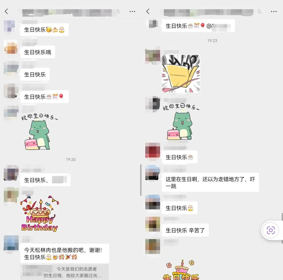 这也带动了良好的社群氛围,微信群中一直保持着积极、和谐的聊天氛围。前几天有一名志愿者过生日,群里面的居民们还刷屏为其庆生。