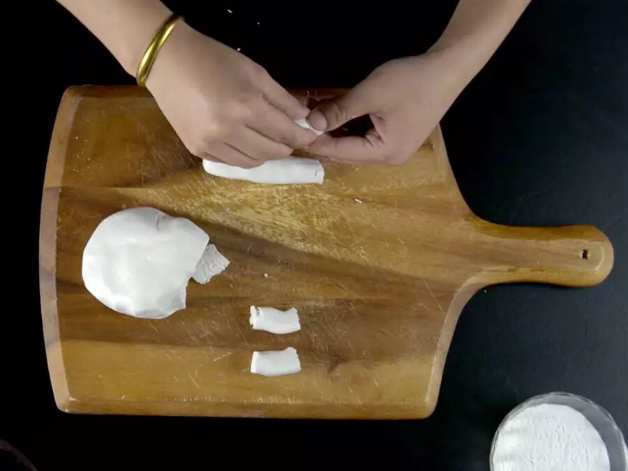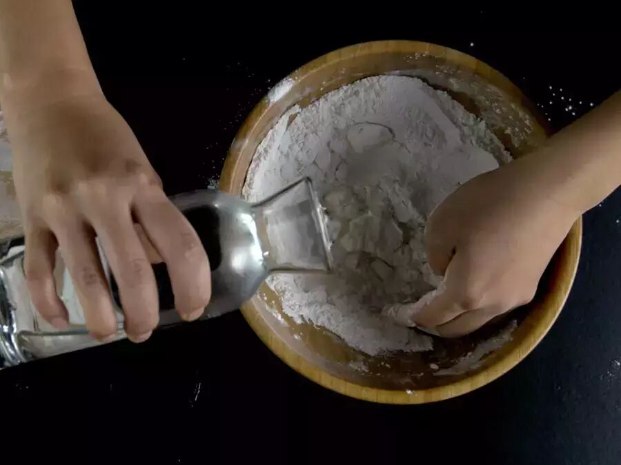 然后将面团分成大小均匀的等份,按压成面皮。