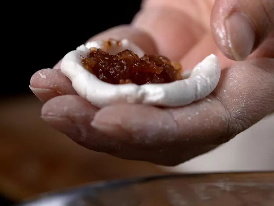 将适量山楂果酱包入其中,揉合搓圆即可。