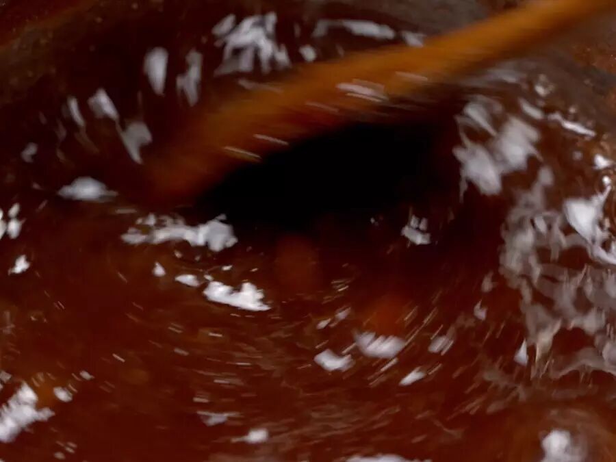 然后加大量的糖和水慢慢熬,大火烧开后,调小火慢慢顺时针搅拌,需要不停搅拌防止粘锅,熬果酱不能心急,慢工才能出细活。
