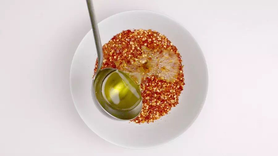 先取一份辣椒粉装入耐热的碗中,将炸过香料的热油淋上一半,均匀搅拌;(这一步主要用150℃左右的高油温爆出辣椒香味和辣味)