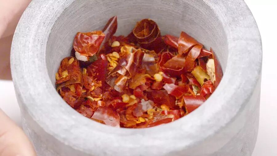 将二荆条、朝天椒干辣椒混合,在热锅中烘炒一下去水分,然后捣碎,磨成粗粒;