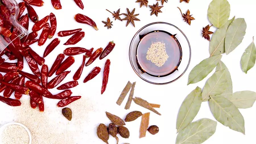 准备食材:二荆条干辣椒200克,朝天椒干辣椒100克,菜籽油500克,八角、桂皮、香叶、草果、山奈、小茴香适量,熟白芝麻适量;