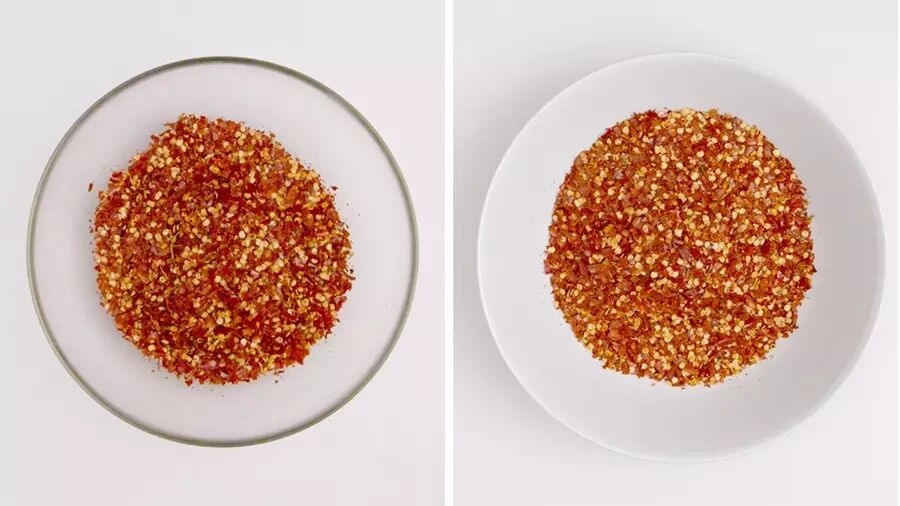 将磨好的辣椒粉分成2份,备用;