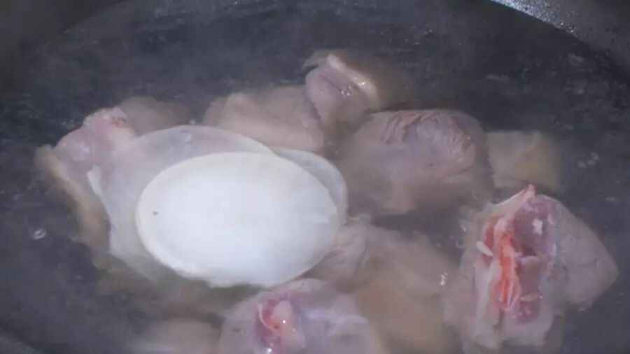 然后将白萝卜洗净,切片。待水烧开后,和羊肉一起放入锅中,滚煮;