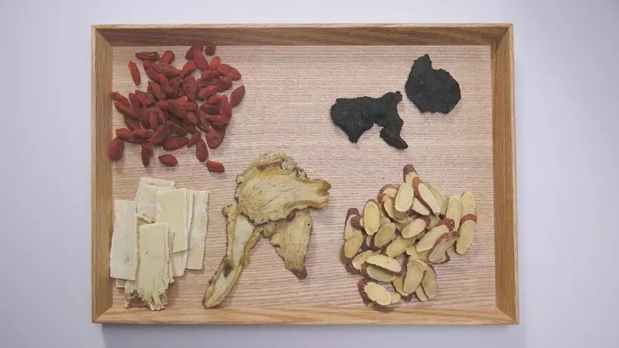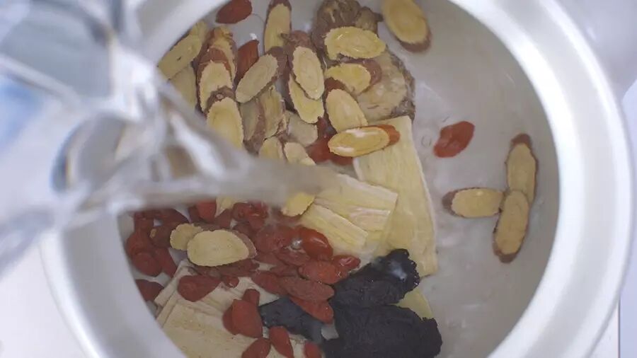 将当归、黄精、黄芪、枸杞、甘草和适量纯净水一起煮,待汤汁出颜色后即关火,备用。
