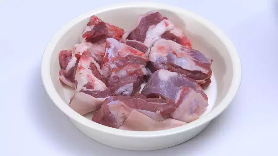 挑选上好的带皮后腿羊肉,这是羊身上最鲜美的部位,剁成大块;