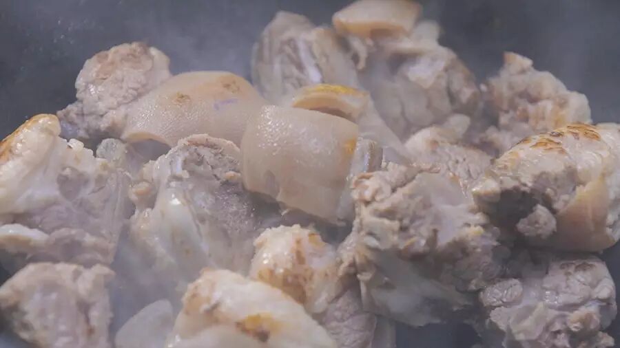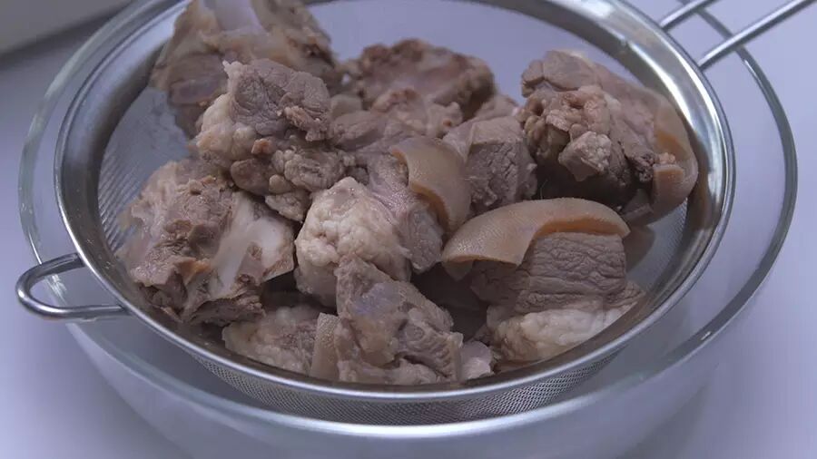 待水的表面浮起一层白沫后,将羊肉取出、清洗、沥干;