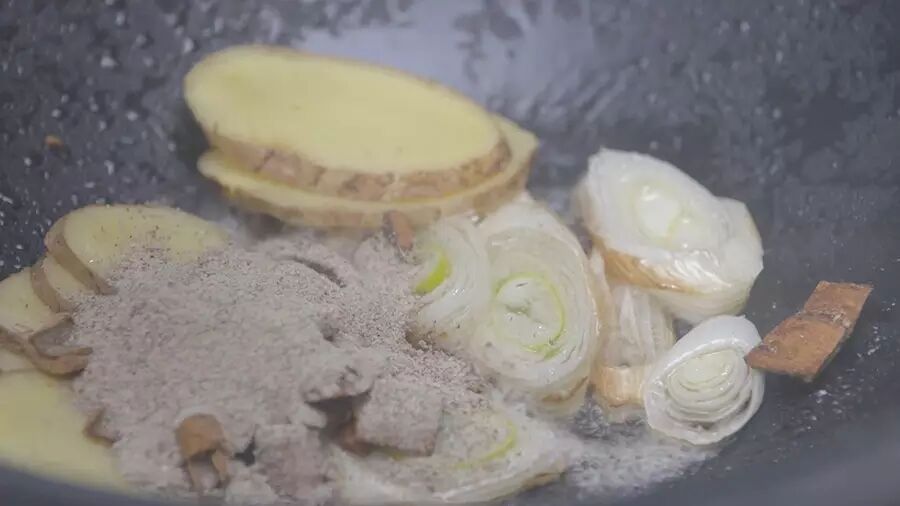 取炒锅加少许油,将生姜、肉桂、胡椒、葱白爆香后,放入羊肉锅中;