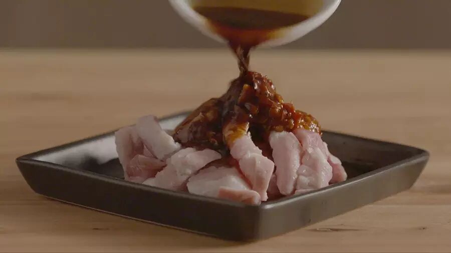 选择肥瘦相间的五花肉,加入豆瓣酱、少量黄酒、酱油,拌匀,密封腌制过夜;