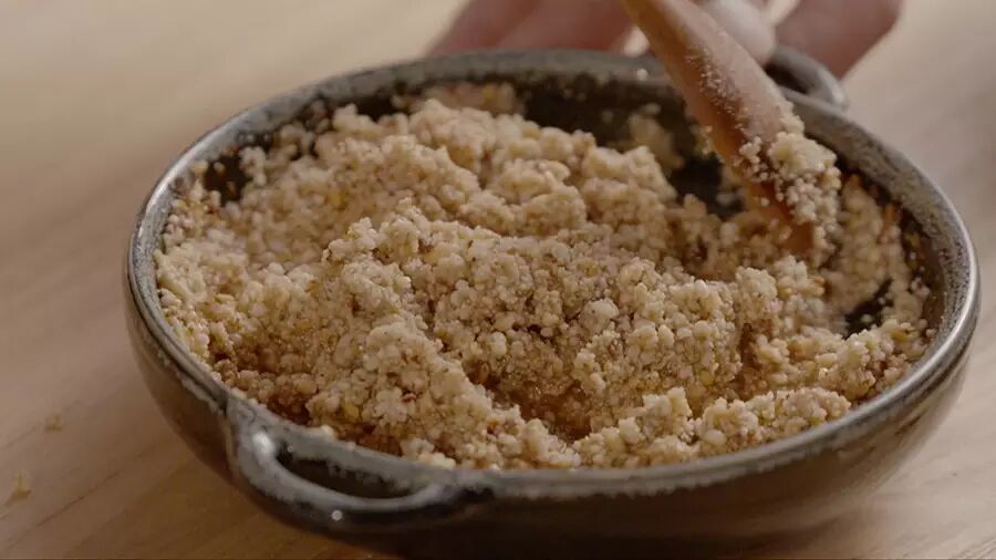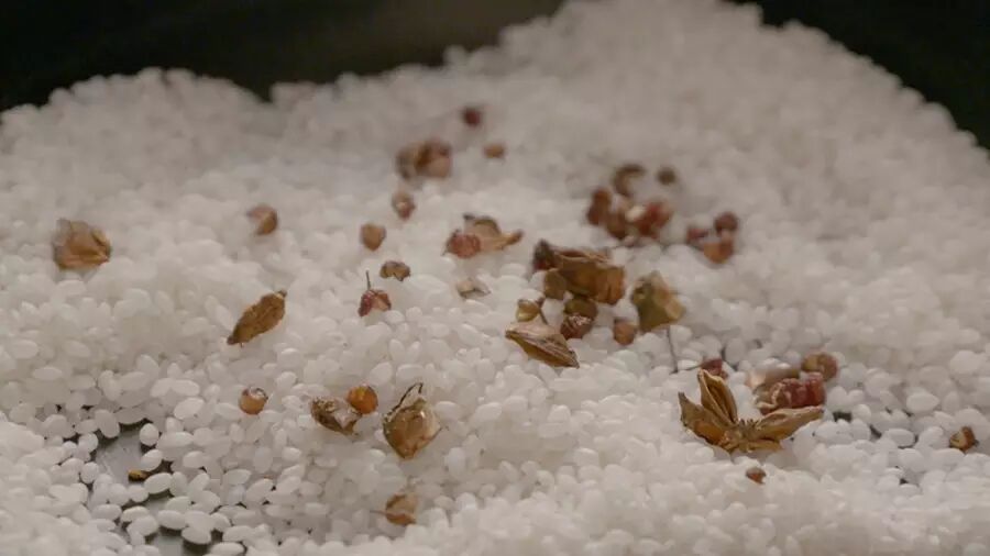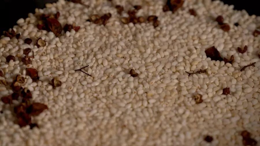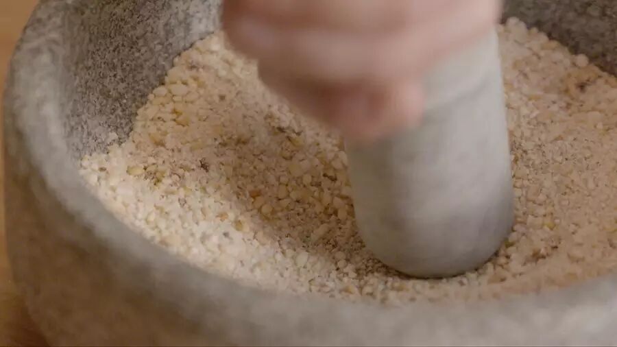 接着把炒好的米连同花椒、八角一起,放入石臼中捣成碎粒。如果没有石臼,可以用料理机来打碎米粉,但不能太细碎,要有颗粒感;
