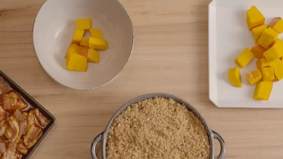 五花肉250克,大米150克,南瓜100克,豆瓣酱两大勺,花椒1小把,八角2-3颗,料酒50毫升,酱油20毫升,香菜少许,水1杯。