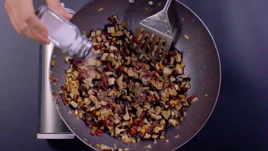 再加入冬菇碎炒匀,放适量冰糖、胡椒粉和盐拌匀,盛出待用;