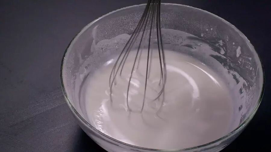 粘米粉和澄粉过2次筛,倒入泡发冬菇的水,搅成稀糊状;