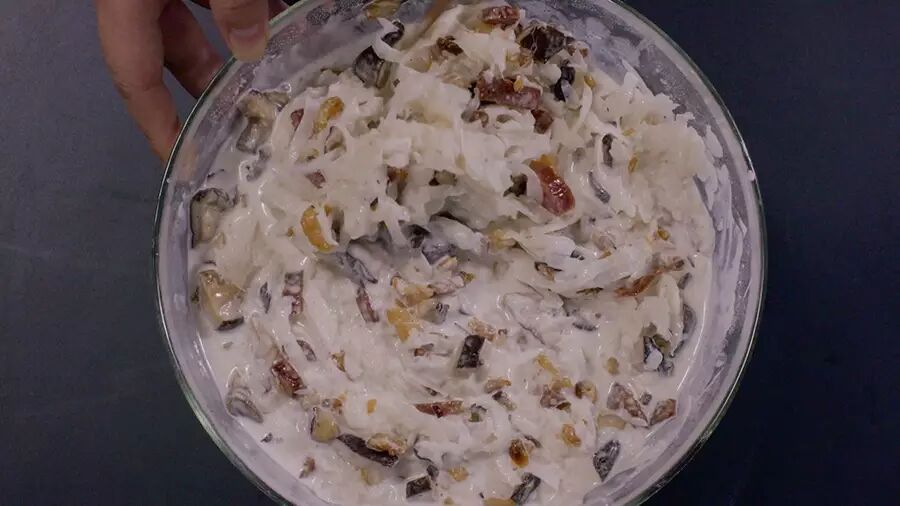 放入全部炒好的食材中,充分搅拌均匀,静置片刻,让萝卜汁水析出,使口味平衡;