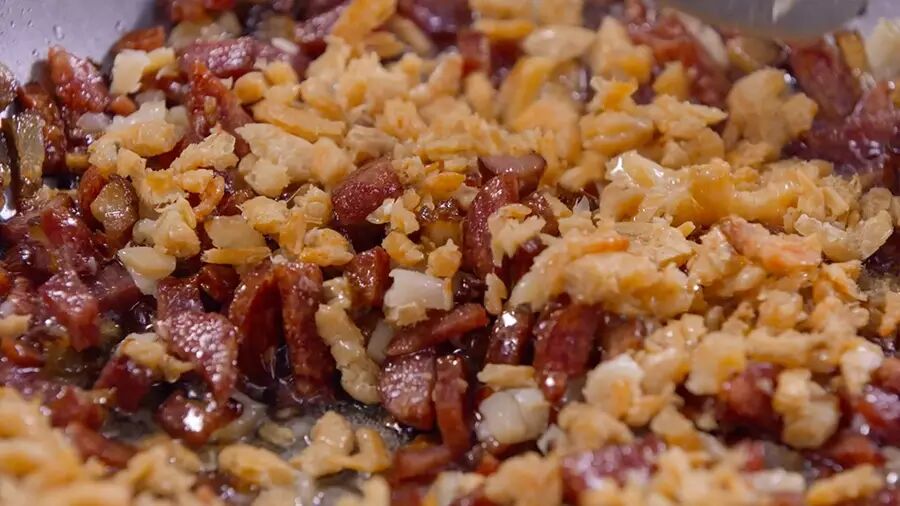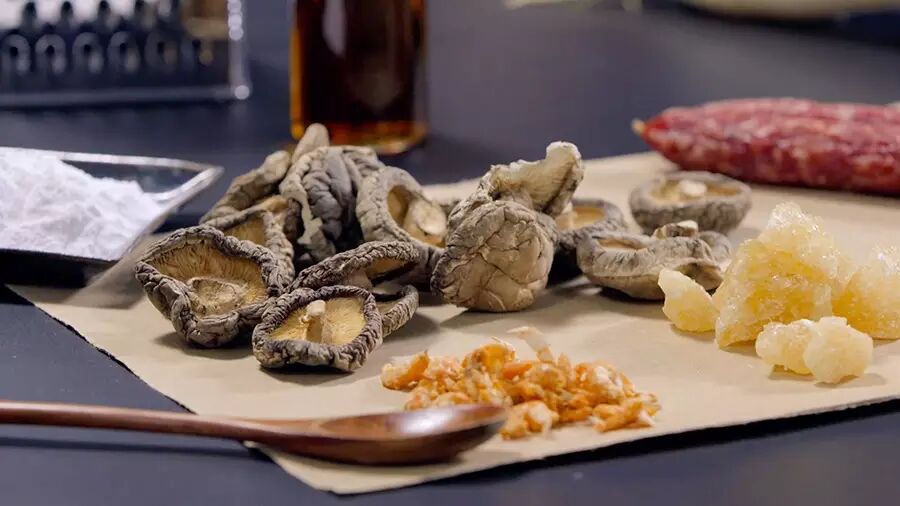 接下来将锅加油烧热后,放腊肉和腊肠爆炒,等脂肪部分变得透明后,加入沥干的瑶柱、虾米,炒至香味溢出;