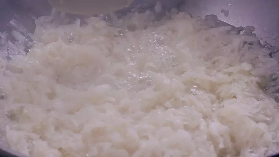 锅洗干净后,放入萝卜丝、泡发瑶柱和冬菇的水,加入冰糖,翻炒,直至萝卜变透明,熄火;