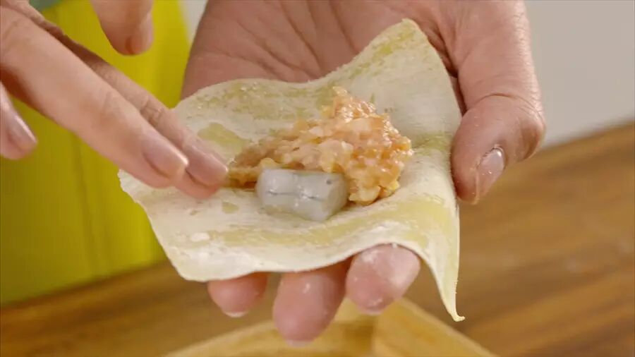 接下来包云吞,将云吞皮放在手心,放上虾仁和肉馅,用手指蘸水沿馅料点两下,抓起对折,再用另一只手的虎口夹紧收口,合成凤尾形状,云吞就包好了。 (一般都是用整颗虾仁,我们选用的面皮较小,故虾仁改了一下刀,取小粒)