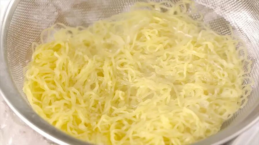 先将面条抖抖散,煮一分钟,差不多六七分熟的时候捞出,放冰水中过一下,再重新放回锅中回热十来秒,面就煮好了;