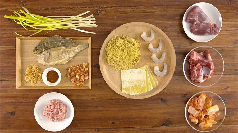 汤底:大地鱼干1份,瘦肉1块,猪骨1块,鸡块半斤,虾干、虾皮、虾籽粉少许。
