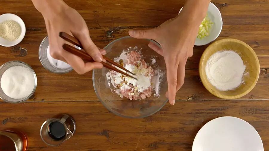 先调肉馅,将半肥瘦的肉糜、韭黄碎、生粉、盐、糖、生抽、料酒、鸡粉放入碗中,用筷子同方向搅拌均匀,直到搅拌出胶质为佳,除了肉糜,虾仁也是馅料的重要部分,最好用海虾,口感更为爽口。