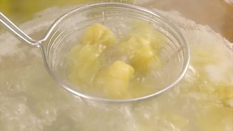 然后煮云吞,水烧沸后先下云吞,两三分钟后,等云吞浮出水面,就可以捞出;