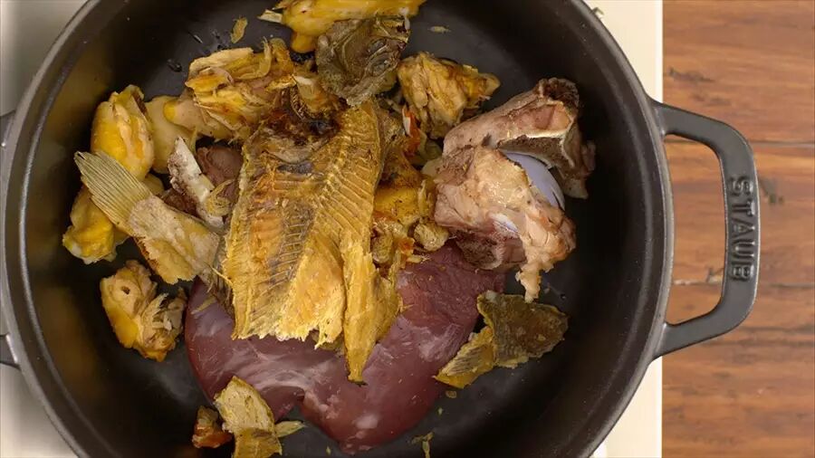 好吃的云吞面,汤底很重要。嘉宾选用猪瘦肉、焯过水的猪骨、鸡块、虾皮、虾干,少许虾籽粉,以及烤制过的大地鱼干掰碎跟上述材料一起放入锅中,加水大火煲开,再转小火慢炖两三个小时,尽量保持汤底清澈;